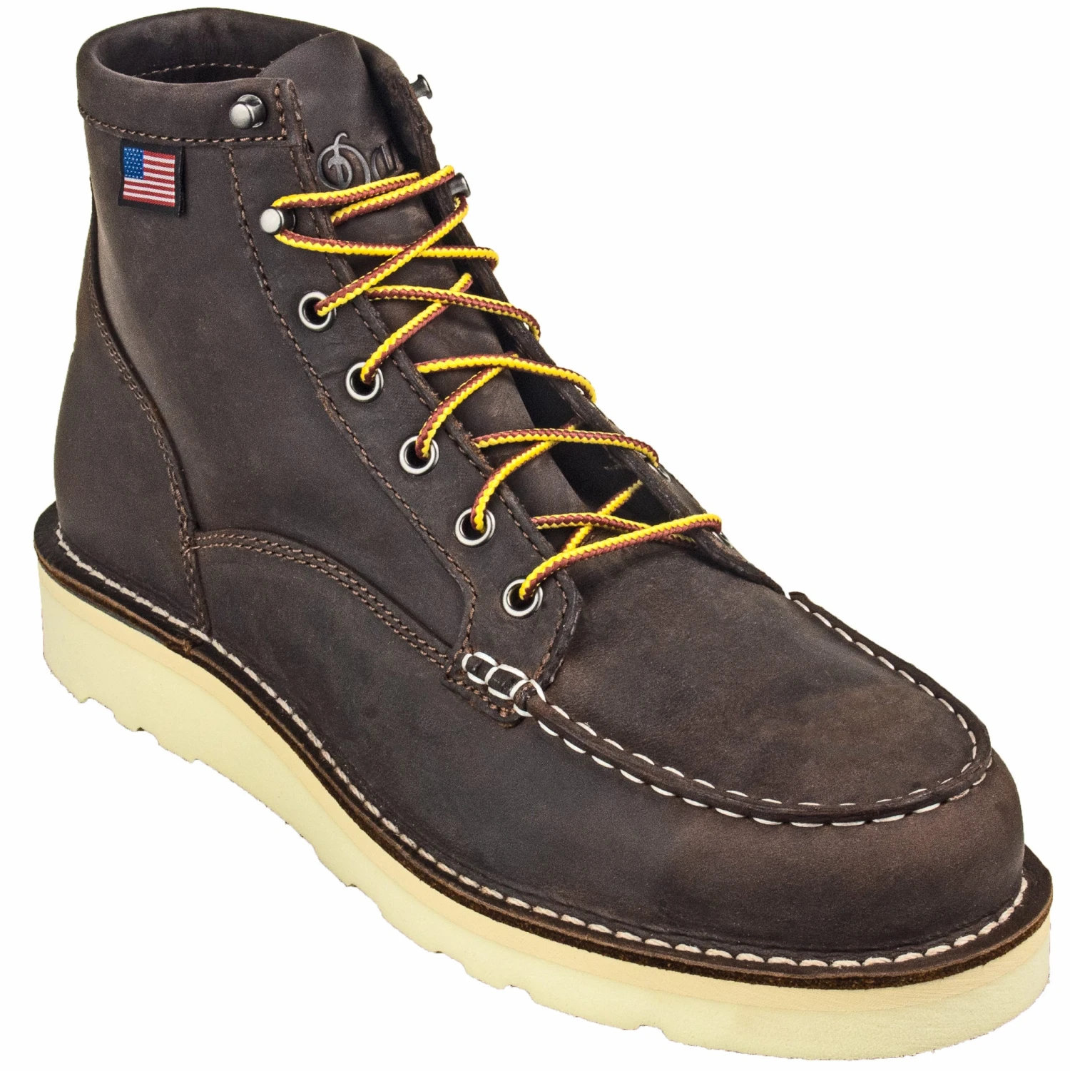 The Danner work boots for men are 6 inches tall, a great height for support and protection without being too confining. They feature a moc-toe design and attractive contrasting stitching. Five eyelets and two speed-hooks help provide a secure and comfortable fit. The safety toe oil-resistant footwear proudly displays the Danner name across the tongue and a small American flag on the side.