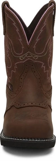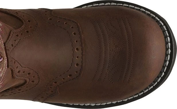These Justin boots feature an 8″ aged bark with a diamond cut pull strap, so it’ll last some for time! The foot is aged bark—a material that looks great and holds up well. You’ll delight in the Gypsy round toe with a steel shank. These steel toe boots are ASTM electrical hazard rated, too. The outsole is a black rubber unit logger, so it will last for years to come. They feature the J-Flex comfort system, so you can feel good in knowing these women’s boots will keep you comfortable the entire workday long.