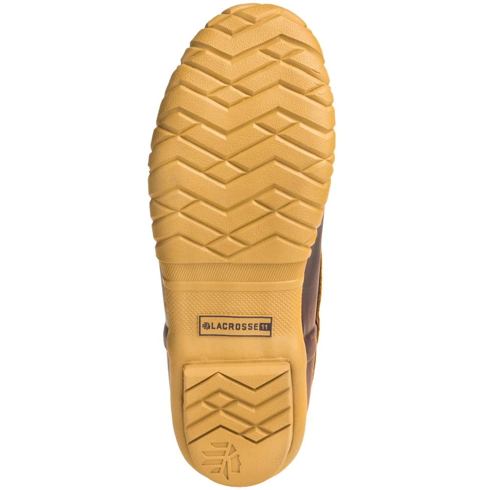 Designed originally with late-season bird hunting in mind, these popular winter boots have proven the perfect choice for all kinds of wet weather winter mud, muck, and slush. The rugged uppers on these men’s rubber bottomed boots are distressed, oiled, full-grain leather for ten inches of water-resistant ankle support and protection for you all winter long. The benefit to full-grain leather is that the natural ability of this durable and supple leather actually grows stronger over time, developing a natural sheen and self-protecting outer layer as the leather ages. This means your men’s leather boots are actually stronger after the first few years, not to mention the supple leather will also have formed a custom fit around your ankle. That doesn’t mean they’re not strong and protective right off the bat – they are, they just get better with time. They’re kind of a like a fine wine, if you will. The leather finger pulls at the top seam make getting this LaCrosse boots on, even over heavy winter socks, quick and easy.